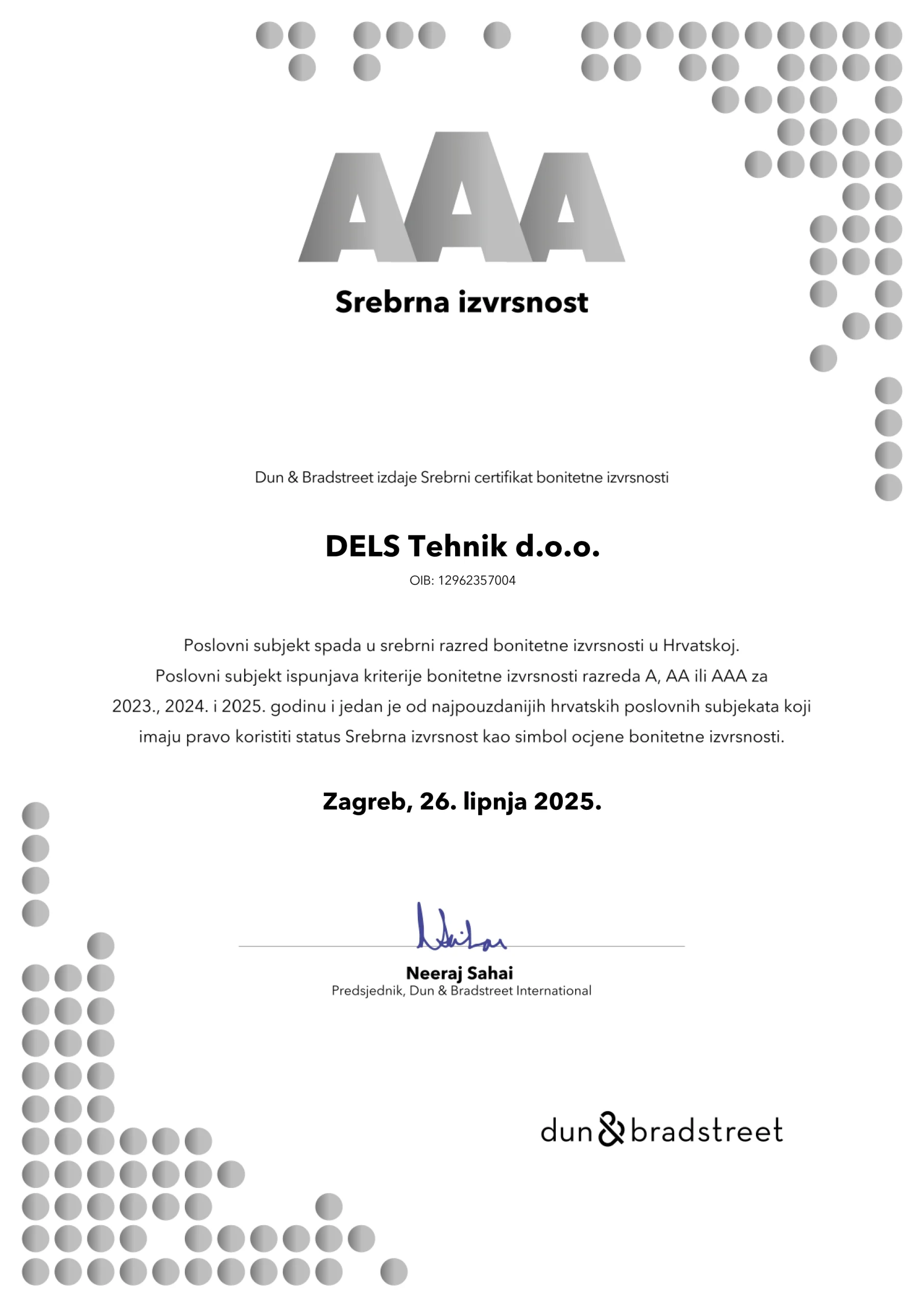 Dana 26. lipnja 2025. dodjeljen nam je Srebrni certifikat bonitetne izvrsnosti, koji dodjeljuje međunarodna bonitetna kuća Dun & Bradstreet, čime smo svrstani u najviši AAA bonitetni razred. Dun & Bradstreet potvrdio je da naša tvrtka već tri godine zaredom posluje stabilno, odgovorno i pouzdano – što nas svrstava među najbonitetnije tvrtke u Hrvatskoj